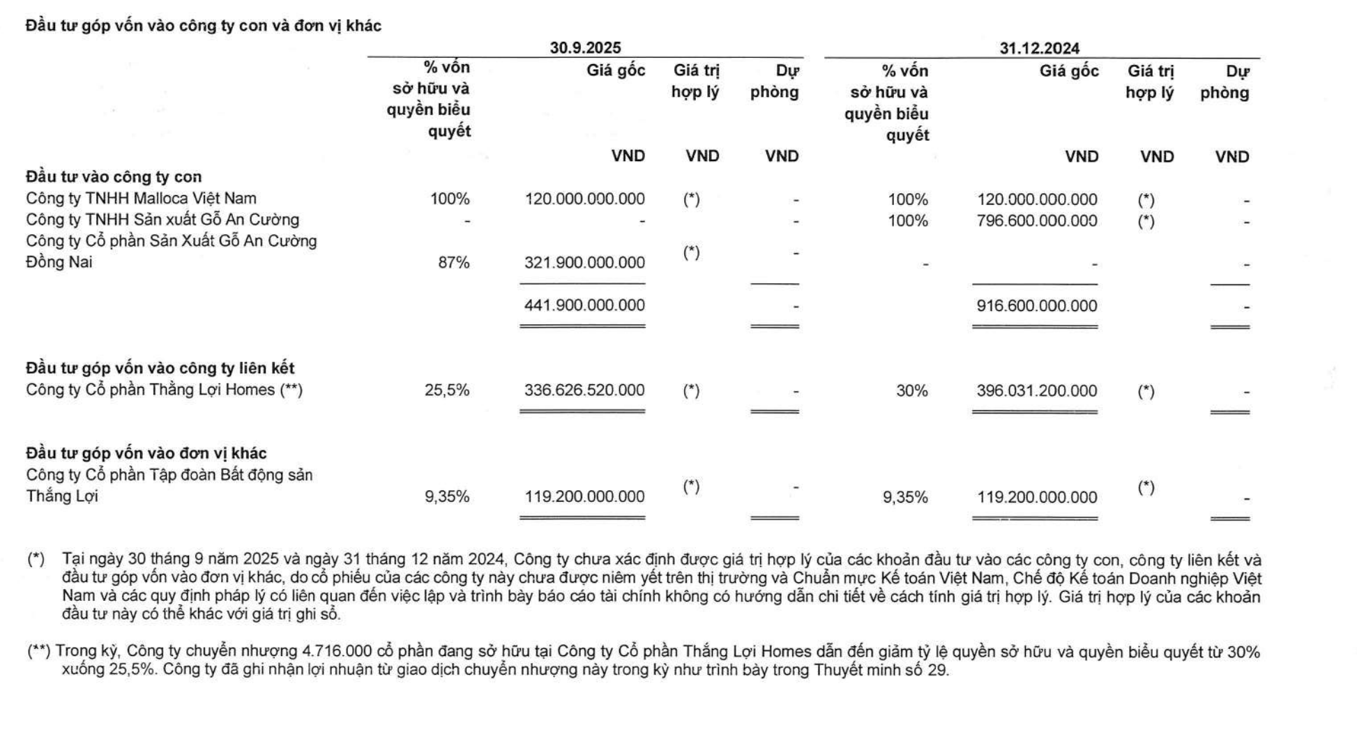 Tính tới ngày 30/9/2025, Gỗ An Cường đang sở hữu 25,5% (đầu năm sở hữu tới 30%) vốn tại Thắng Lợi Homes, đơn vị hoạt động trong lĩnh vực kinh doanh bất động sản và phát triển các dự án dân cư. Trong đó, điểm đáng lưu ý, trong 9 tháng đầu năm 2025, Gỗ An Cường đã chuyển nhượng 4.716.000 cổ phiếu Thắng Lợi Homes dẫn đến giảm sở hữu từ 30%, về 25,5%.