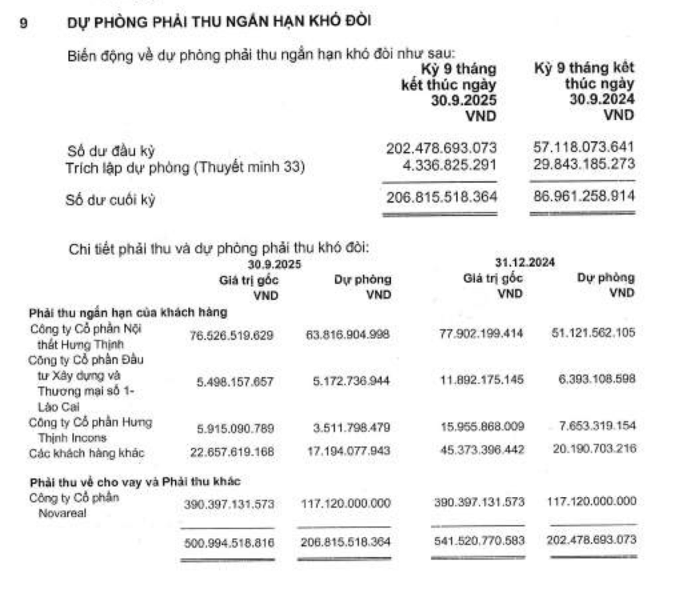 Thêm nữa, tại thời điểm 30/9/2025, Gỗ An Cường vẫn đang ghi nhận phải thu gốc 500,99 tỷ đồng, dự phòng 206,8 tỷ đồng (đầu năm dự phòng 202,48 tỷ đồng). Trong đó, xuất hiện một số khoản dự phòng tại các công ty bất động sản lớn.