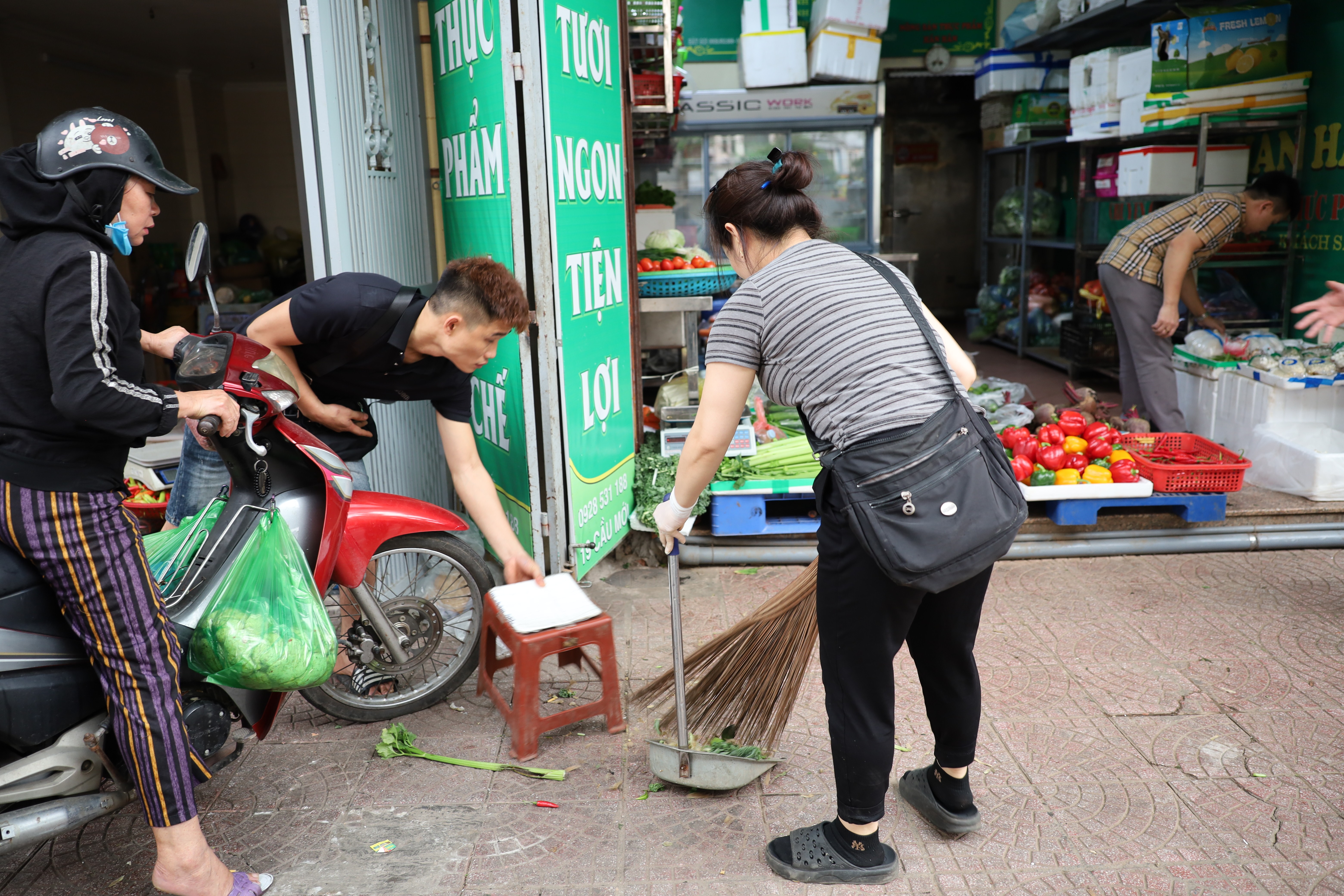 Mỗi tiểu thương đều tự thu gom rác trước khu vực kinh doanh ngay khi phát sinh. Ảnh: Hoa Thành