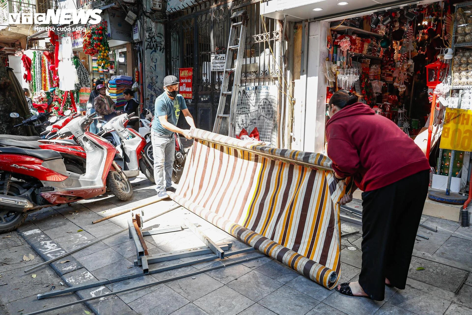 Nhiều mái che và khung sắt cơi nới tồn tại nhiều năm trên các tuyến phố ở phường Hoàn Kiếm đang được người dân phối hợp cùng lực lượng chức năng tháo dỡ. (Ảnh: Minh Đức)