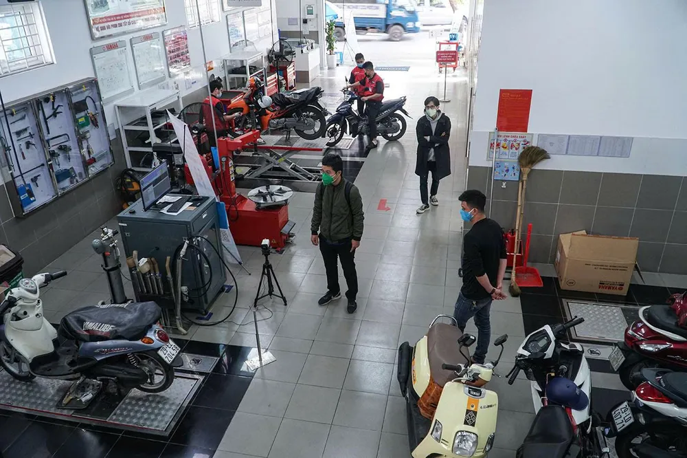 Nhân viên đăng kiểm hạng III được tham gia kiểm định khí thải đối với xe máy. Ảnh: V.LONG