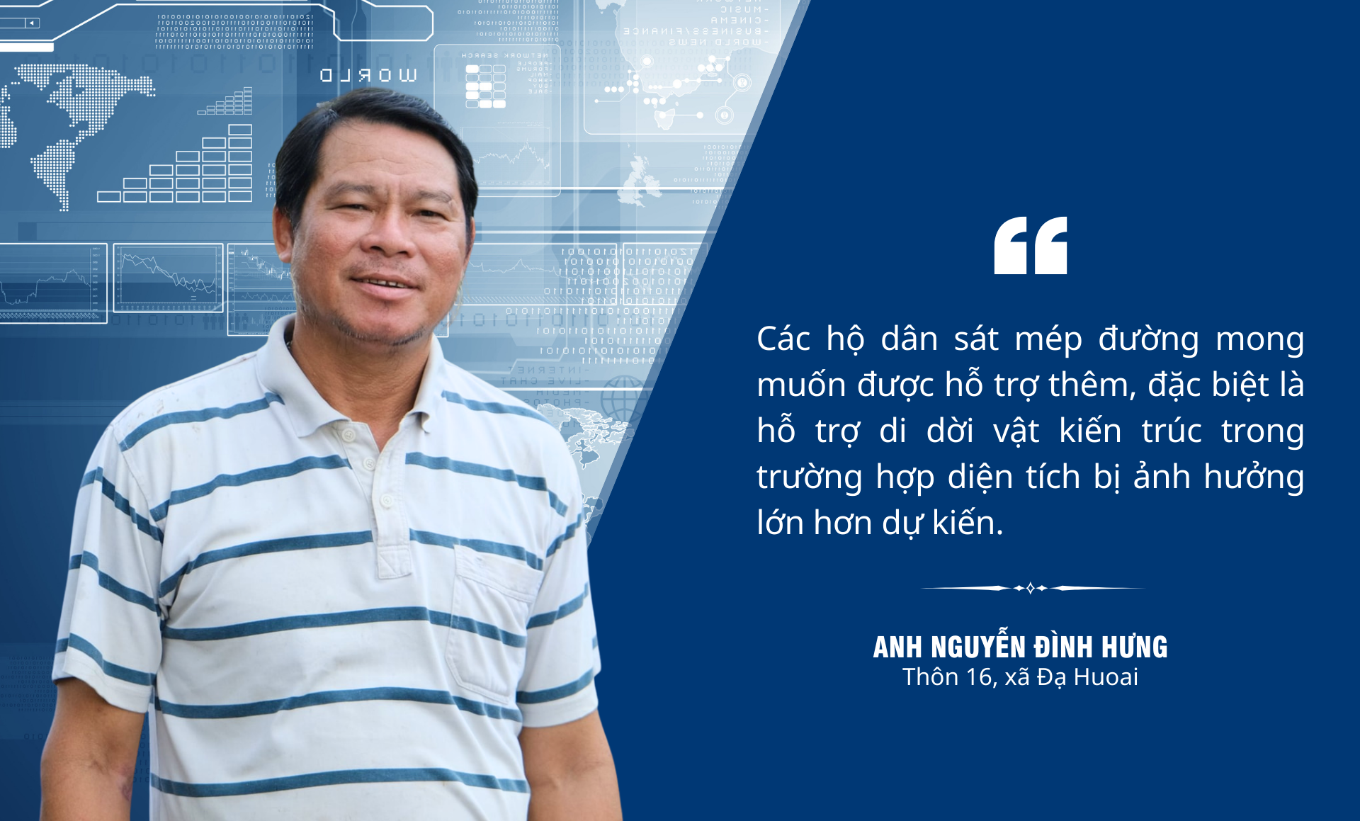 Tại Thôn 16, xã Đạ Huoai, anh Nguyễn Đình Hưng, một hộ dân có khoảng 300m² đất bị ảnh hưởng cho biết, gia đình anh đã tự nguyện bàn giao mặt bằng ngay từ khi dự án triển khai để tạo điều kiện cho đơn vị thi công.