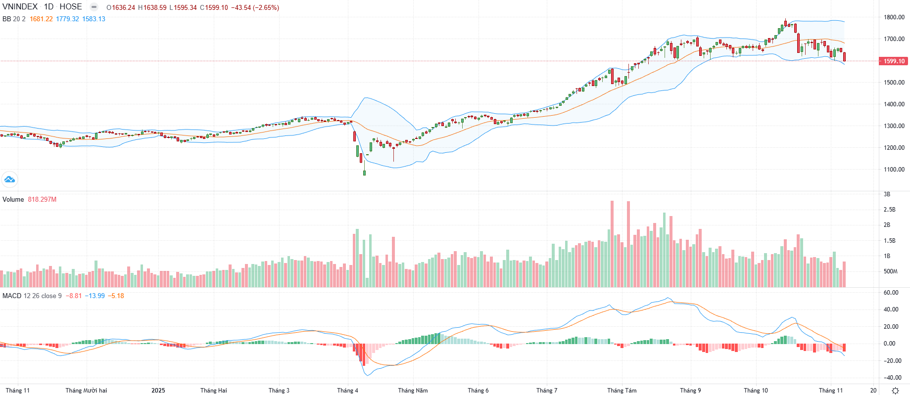 Trong phiên cuối tuần trước, chỉ số VN-Index điều chỉnh mạnh, lùi sâu về sát vùng hỗ trợ 1.600 điểm. Dù có nhịp hồi trong phiên, chỉ số vẫn đóng cửa tại sát mốc hỗ trợ, phản ánh sự giằng co và tâm lý thận trọng của thị trường.