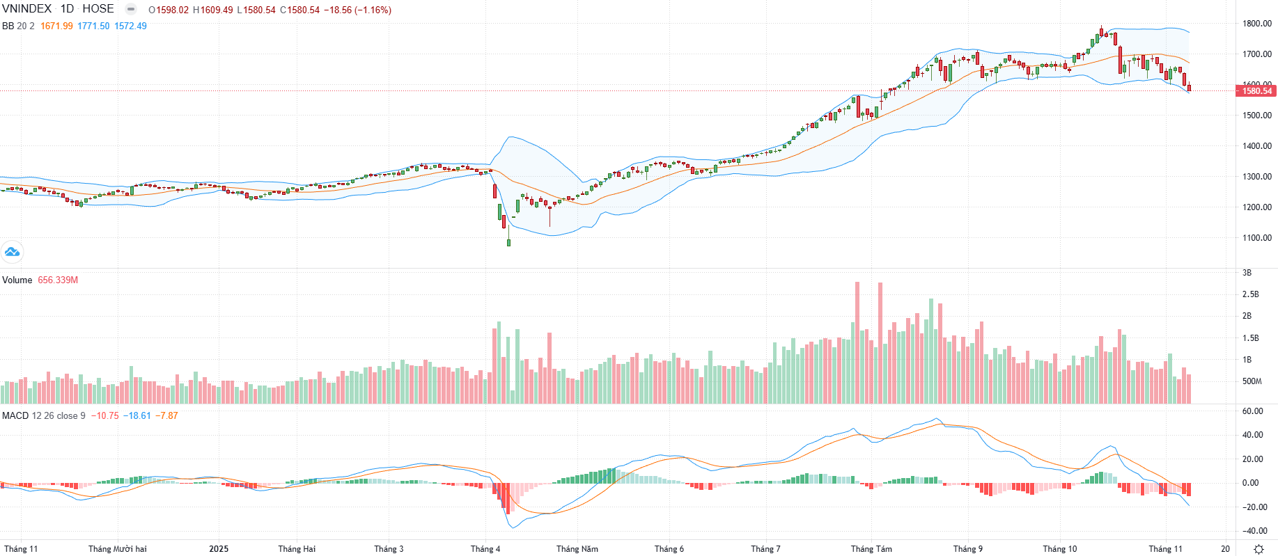 Chỉ số VN-Index tiếp tục giảm điểm sau khi đánh mất vùng hỗ trợ mạnh 1.600 điểm, cho thấy tín hiệu suy yếu rõ rệt về mặt kỹ thuật. Mốc 1.600 hiện đã đảo chiều trở thành vùng kháng cự quan trọng, đồng thời mở ra giai đoạn tiềm ẩn nhiều rủi ro hơn cho chỉ số.