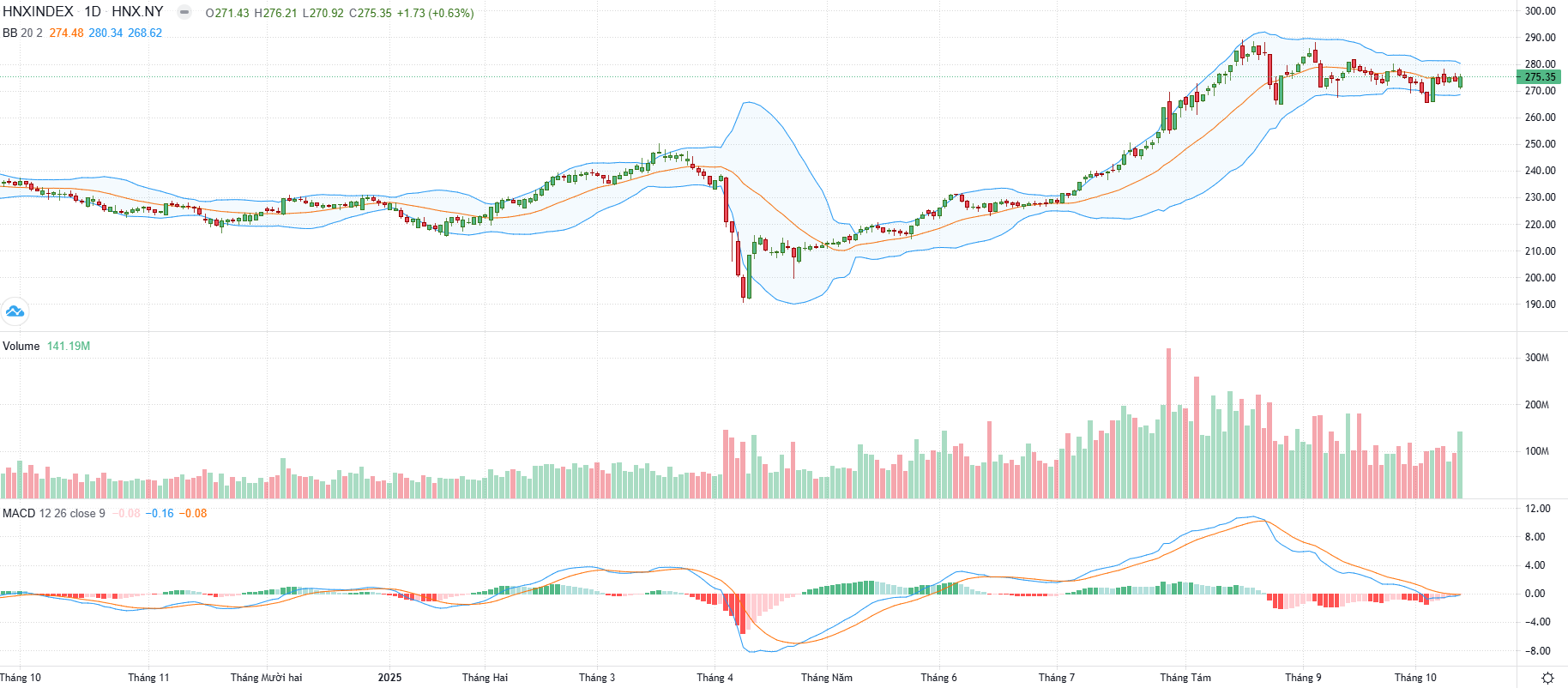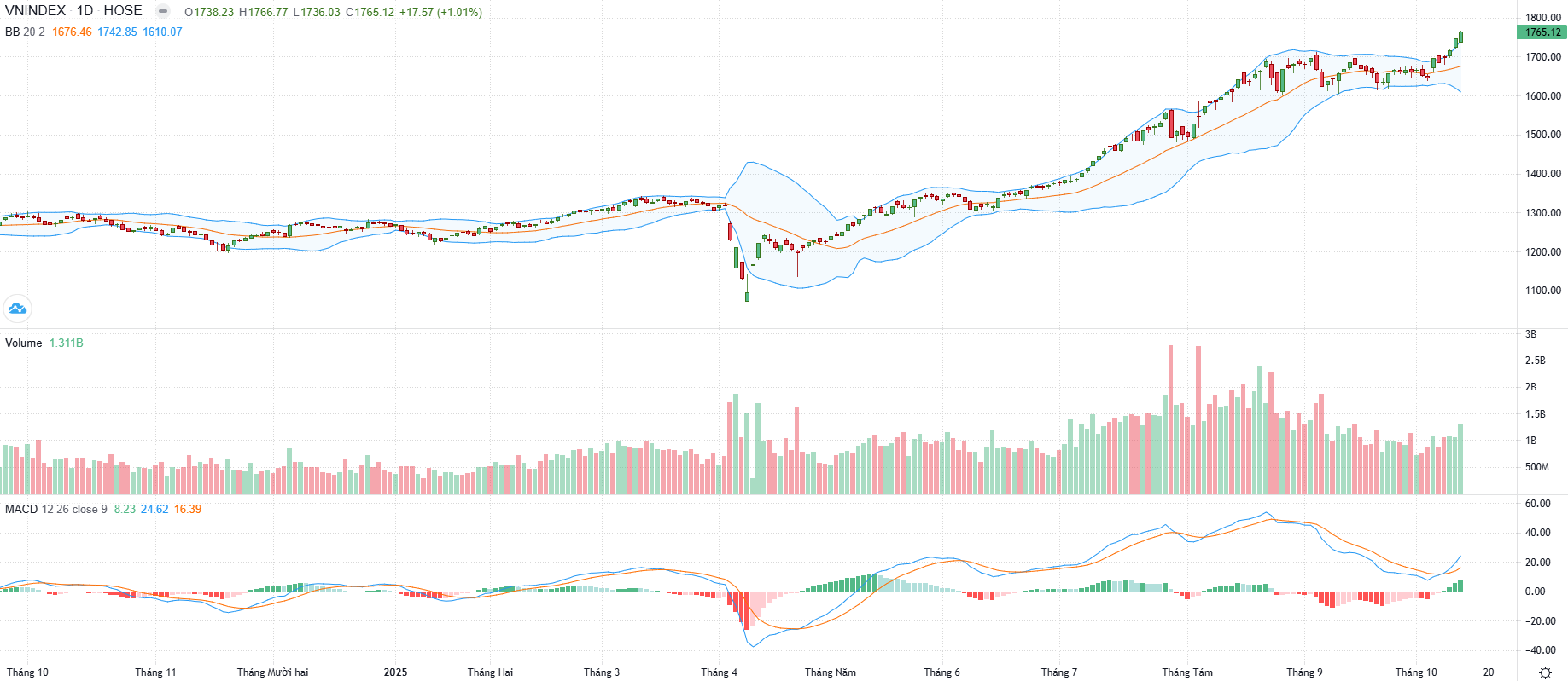 Ở khung đồ thị ngày, chỉ số chung tiếp tục bám sát đường biên trên dải Bollinger band và chinh phục các mốc điểm cao mới. Các chỉ báo RSI và MACD hướng lên, đồng thời đường +DI neo trên mốc 25 góp phần củng cố cho vận động tăng điểm hiện tại của VN-Index.