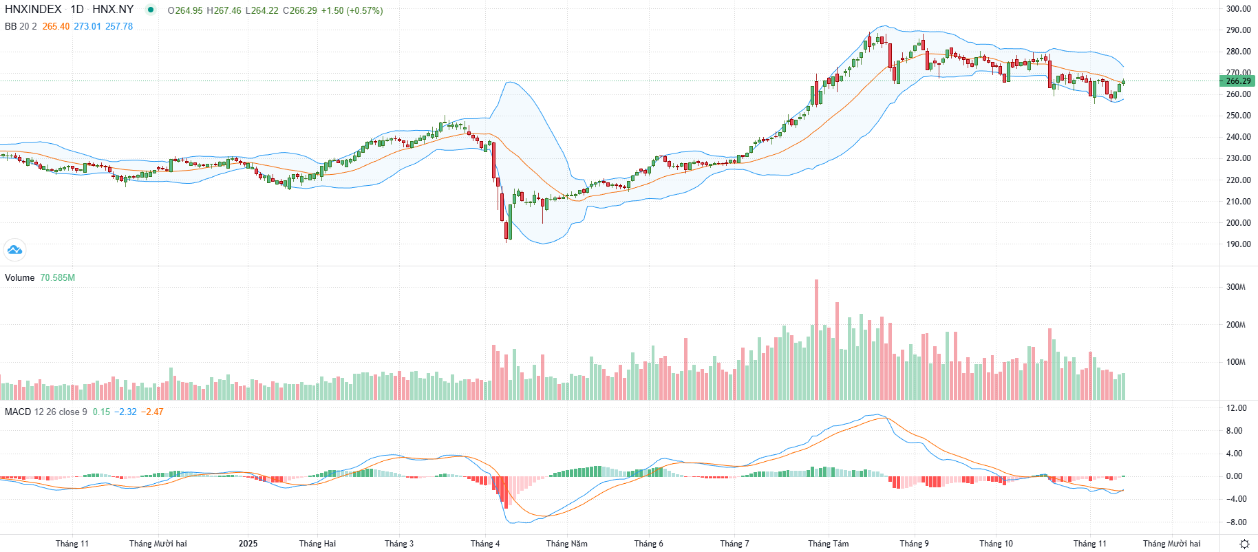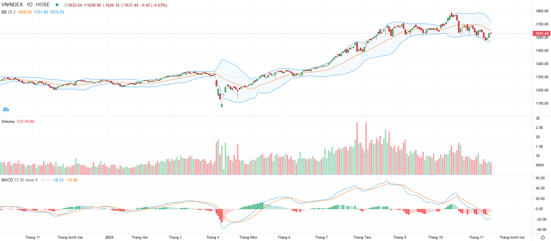 Trên khung đồ thị ngày, chỉ báo MACD đều hướng lên, cho thấy chỉ số vẫn đang duy trì nhịp hồi phục. Tuy nhiên, đường RSI có phần bẻ ngang cho thấy VN-Index nhiều khả năng cần thêm thời gian tích lũy để củng cố động lực cho một nhịp tăng bền vững hơn.