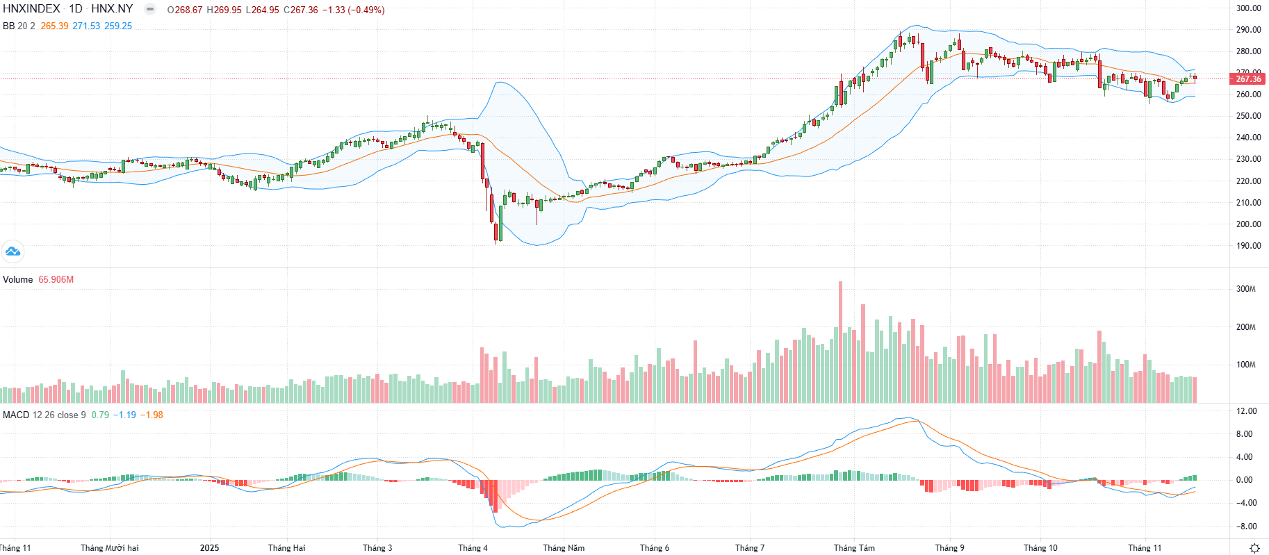 Ở khung đồ thị giờ, VN-Index đang vận động với xu hướng tăng theo dải trên của Bollinger Band. Đồng thời, chỉ báo MACD và RSI đồng thuận dần hướng lên, cho thấy xu hướng hồi phục của chỉ số có thể tiếp diễn trong những phiên tới. Chỉ báo CMF = 0,42, thể hiện dòng tiền vẫn đang tiếp tục được thu hút trở lại thị trường.
