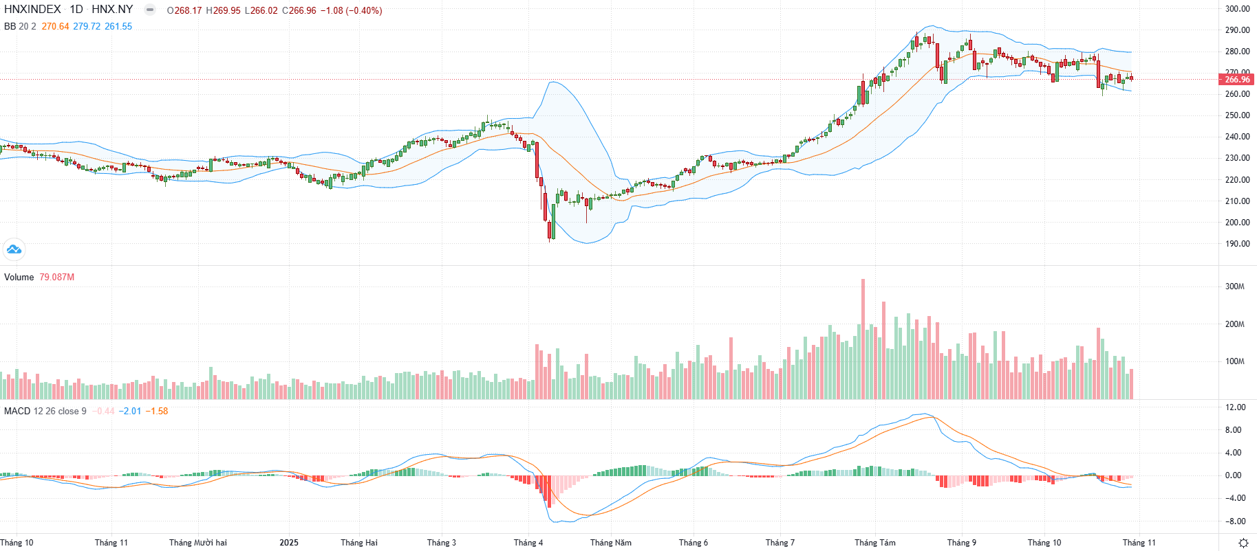 Trên khung đồ thị giờ, chỉ số VN-Index vận động bám sát đường MA20 và dải Bollinger band bo hẹp thể hiện cho vận động đi ngang tích lũy quanh vùng 1.670-1.690 điểm. Cùng với đó, chỉ báo CMF vẫn duy trì dưới mốc 0 cho thấy dòng tiền đang phân hóa và chưa thực sự lan tỏa mạnh mẽ trên thị trường.