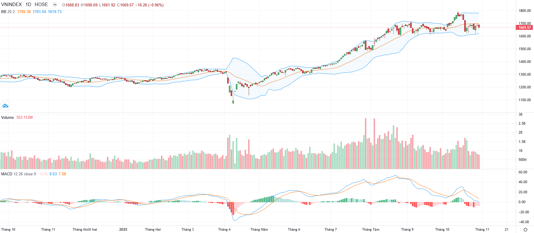 Đồng thời, động lực phục hồi từ các phiên trước đã bị phân tán rõ rệt, do đó khả năng vượt kháng cự 1.700 điểm trở nên ít đi, thay vào đó là rủi ro điều chỉnh lại vùng 1.620 điểm.