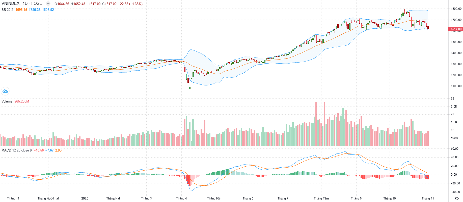 Chỉ số VN-Index tiếp tục điều chỉnh, hiện đang đóng cửa ở vùng hỗ trợ 1.600-1.620 điểm, áp lực bán mạnh lên thể hiện qua khối lượng giao dịch tăng cao hơn so với phiên liền trước.