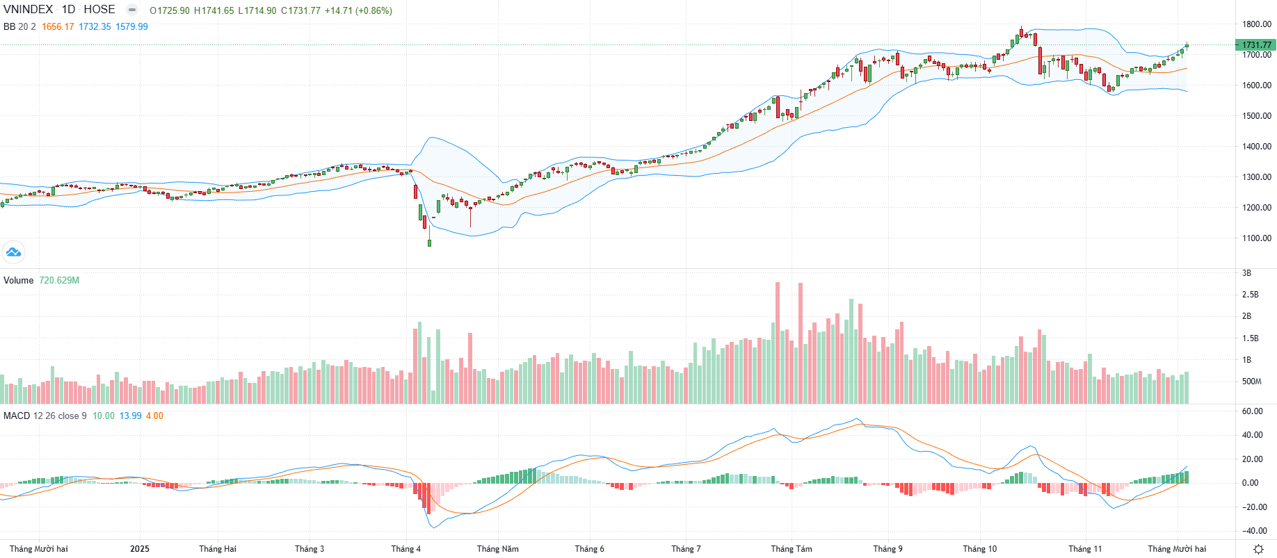 Ở khung đồ thị ngày, chỉ số chung đã chinh phục lại mốc 1.740 điểm với sự cải thiện của thanh khoản mua chủ động.