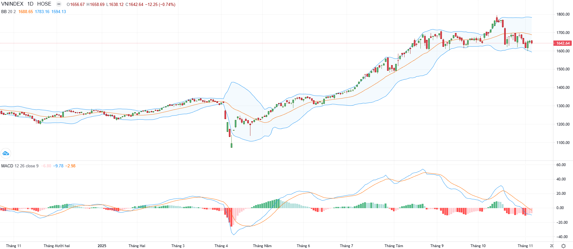 Bên cạnh đó, chỉ báo ADX và đường -DI duy trì trên ngưỡng 25, cho thấy xu hướng điều chỉnh vẫn chưa có dấu hiệu dừng lại, với vùng hỗ trợ ngắn hạn được kỳ vọng quanh vùng 1.620 điểm, tương đương vùng đáy cũ gần nhất.
