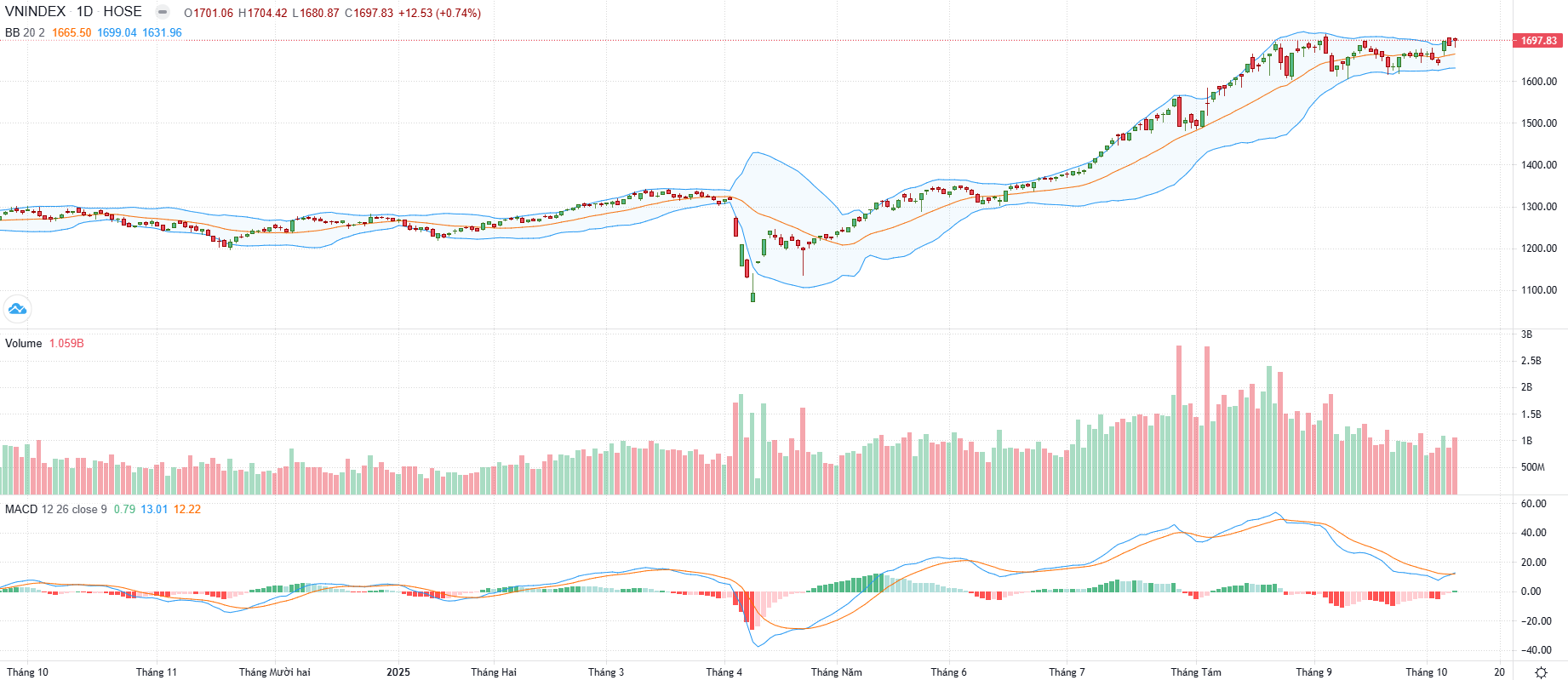 Ở khung đồ thị ngày, chỉ số chung tiếp tục diễn biến củng cố động lực quanh vùng 1.680-1.700 điểm. Chỉ báo MACD có tín hiệu hình thành đáy khi đường MACD giao cắt với đường Signal, đồng thời chỉ số chung vận động trên đường Tenkan của mây Ichimoku cho thấy VN-Index đang dần cân bằng cho xu hướng tăng điểm.