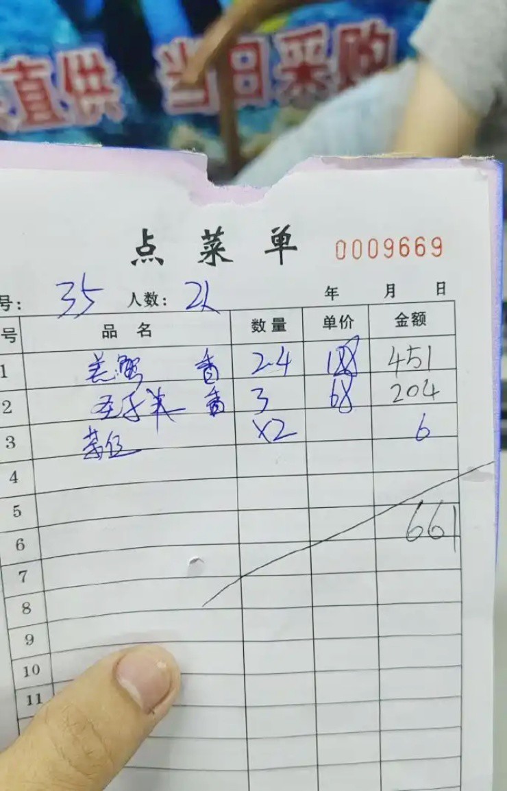 Theo hóa đơn, giá đĩa cua là 451 NDT, đĩa ốc móng tay là 204 NDT, ngoài ra còn cộng thêm 6 NDT tiền trà, tổng cộng là 661 NDT.