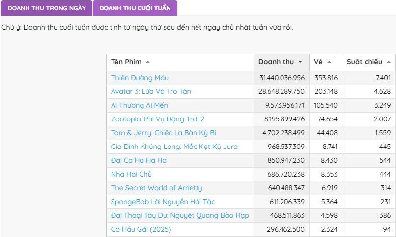 Trong 7 ngày đầu năm 2026, Thiên Đường Máu đạt doanh thu ấn tượng, thậm chí nhiều ngày vượt mặt Avatar 3 để giữ ngôi vương phòng vé. Tính đến hết ngày 7/1, bộ phim có Quang Tuấn, Hoài Lâm, Quách Ngọc Ngoan... đã thu về hơn 70 tỷ đồng, được dự đoán sớm lọt vào "câu lạc bộ trăm tỷ".
