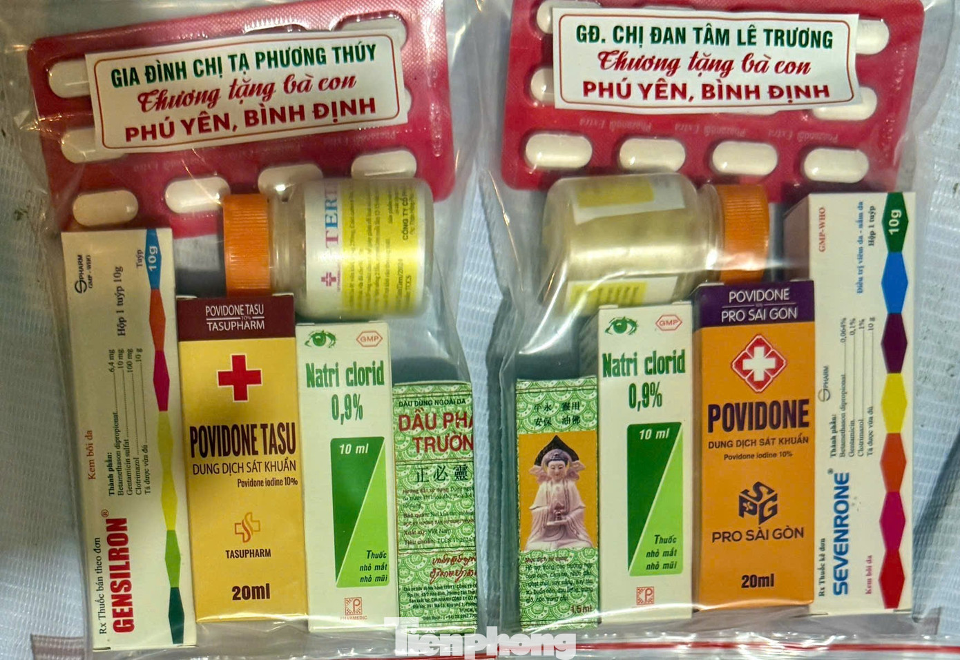 Để bà con tiện dùng, mọi người đã cùng nhau ngồi gói từng suất thuốc nhỏ. Bên trong mỗi suất đầy đủ tất cả các loại thuốc trên. Từ chập tối đến 22h đêm 22/11, hơn 5.000 suất thuốc đã được phân chia và gói xong. Những hộp thuốc được gói cẩn thận trong loại túi zip để chống nước.
