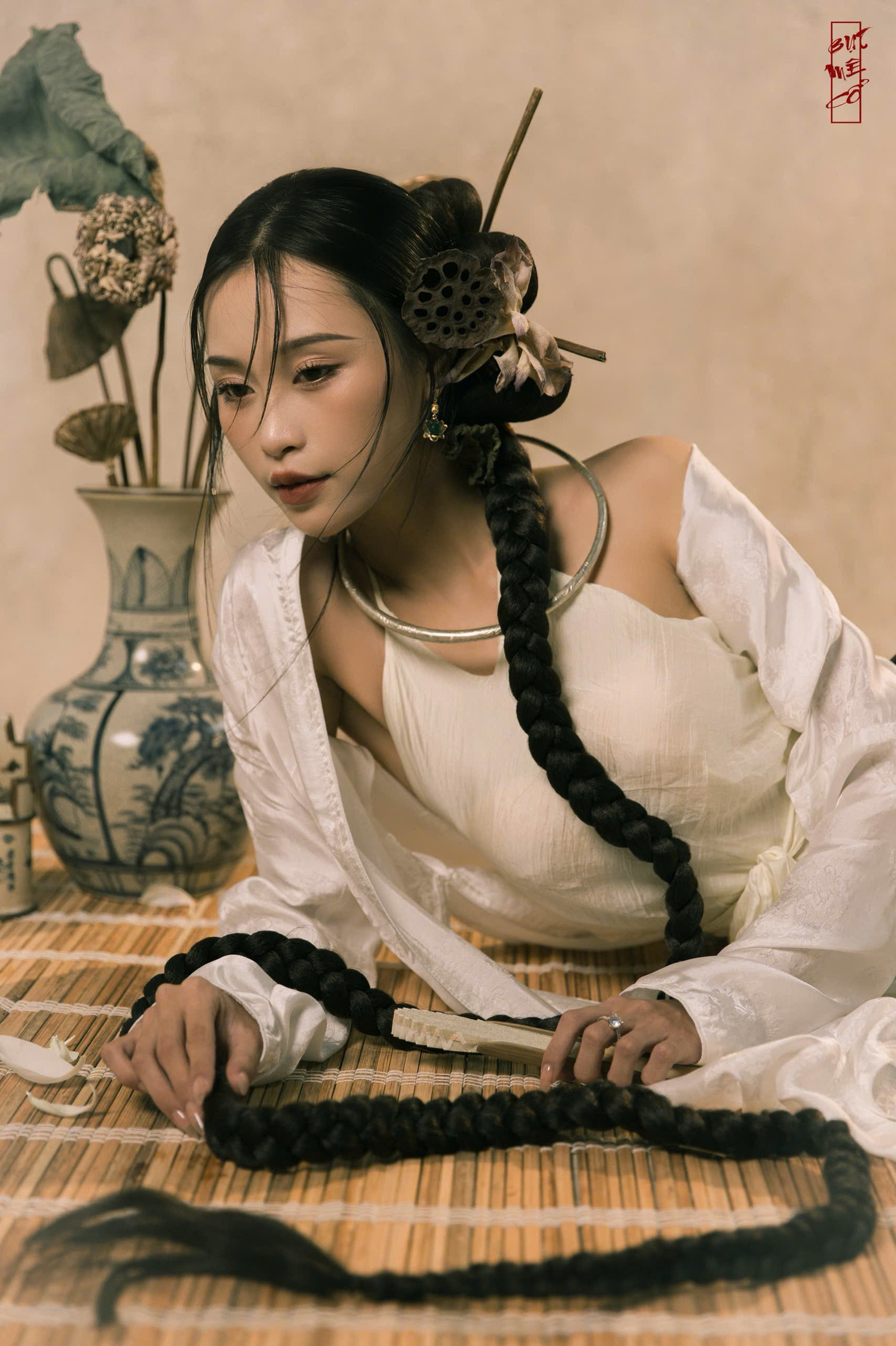 Cảm hứng cho bộ ảnh của Uyên Phụng đến từ hình ảnh người thiếu nữ xưa trong tranh cổ, giữa không gian tĩnh lặng và mộc mạc.