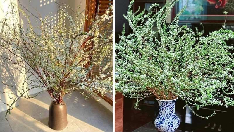 Nổi bật với những chùm hoa trắng li ti, tuyết mai mang đến cảm giác nhẹ nhàng, tinh khôi, phù hợp với phong cách trang trí tối giản, hiện đại. Hoa có độ bền cao, càng cắm lâu nụ càng bung nở đẹp mắt.