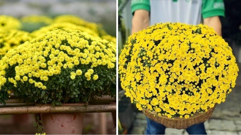 Cúc mâm xôi tròn đầy tượng trưng cho sự viên mãn, sung túc, trong khi cúc đại đóa mang vẻ đẹp rực rỡ, may mắn. Đây là loài hoa phổ biến trong dịp Tết vì màu sắc tươi sáng, bền lâu và mang lại năng lượng tích cực.