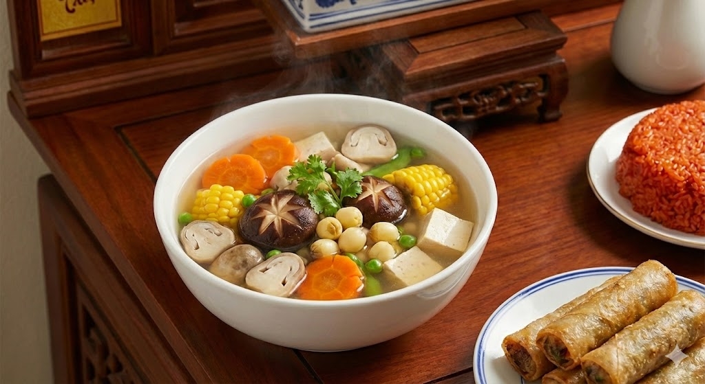 Món canh nấm ngũ sắc nóng hổi, nghi ngút khói đặt cạnh bát xôi gấc đỏ tươi sẽ làm mâm cỗ chay mùng 1 của bạn thêm phần trang trọng và ấm cúng.