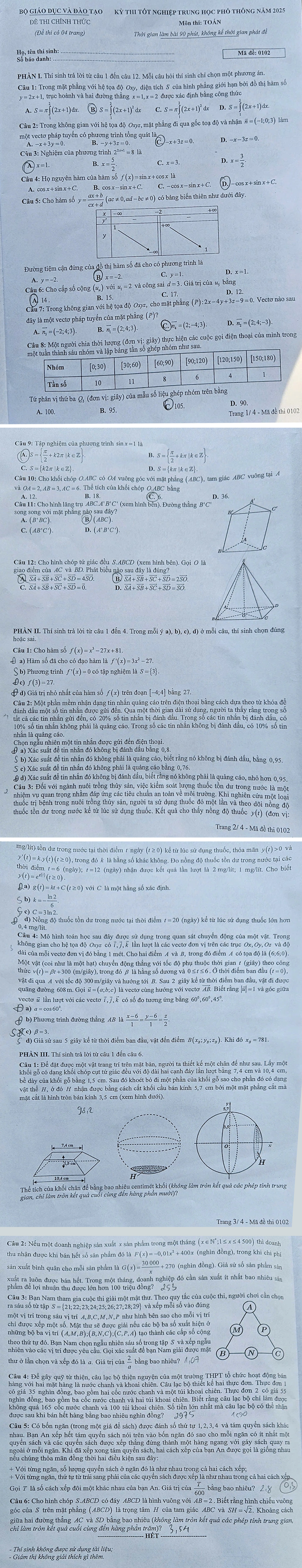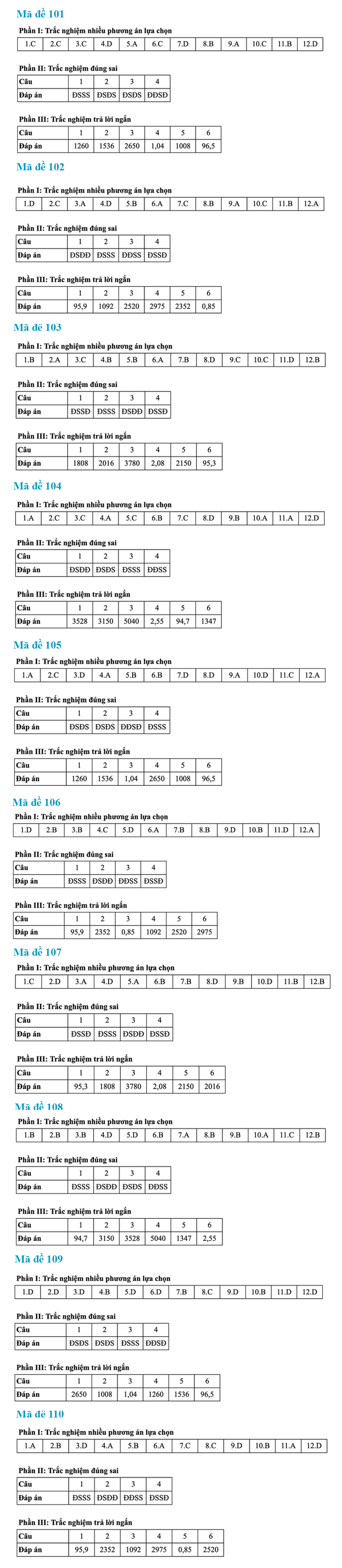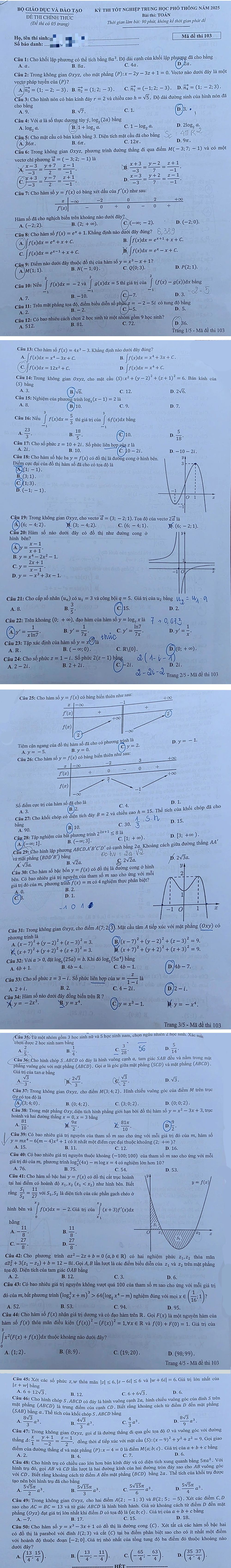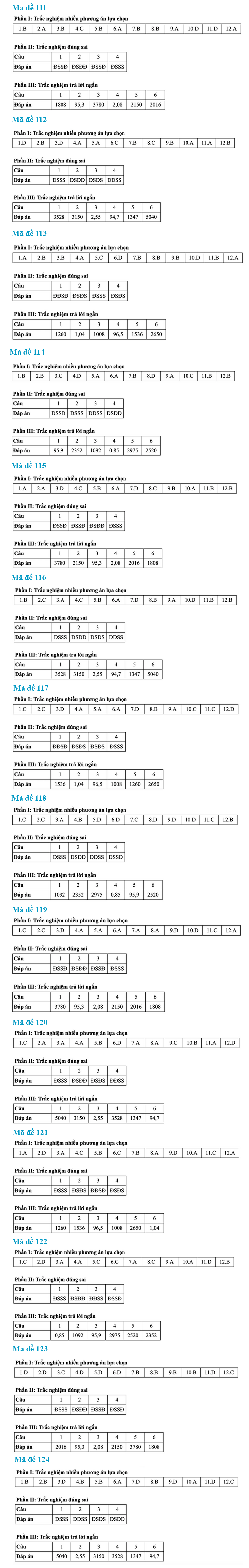 Dưới đây là gợi ý đáp án toàn bộ 24 mã đề thi môn Toán tốt nghiệp THPT năm 2025:
