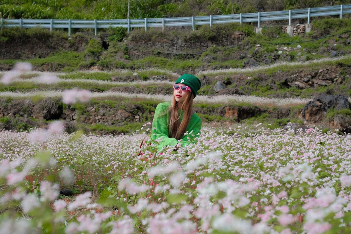 Trên đường tới Mã Pí Lèng, du khách dừng chân tại mỏm đá “Tử thần” để chiêm ngưỡng sông Nho Quế từ trên cao. Trên đường về Pả Vi (Mèo Vạc) ăn trưa, những vườn tam giác mạch nở rộ trở thành điểm dừng chân hấp dẫn để chụp ảnh. Ảnh Aki Lan