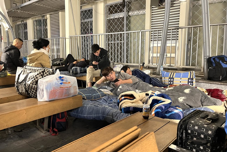 Men theo hành lang dài, chúng tôi bắt gặp những người nhà bệnh nhân ngồi dựa lưng vào tường, ôm túi đồ cá nhân, gương mặt phờ phạc vì nhiều đêm thiếu ngủ. Có người tranh thủ chợp mắt trên chiếc ghế, có người trải bìa carton nằm tạm dưới sàn gạch. Họ là những "bệnh nhân không giường bệnh", những người âm thầm chịu đựng song hành cùng nỗi đau của người thân.