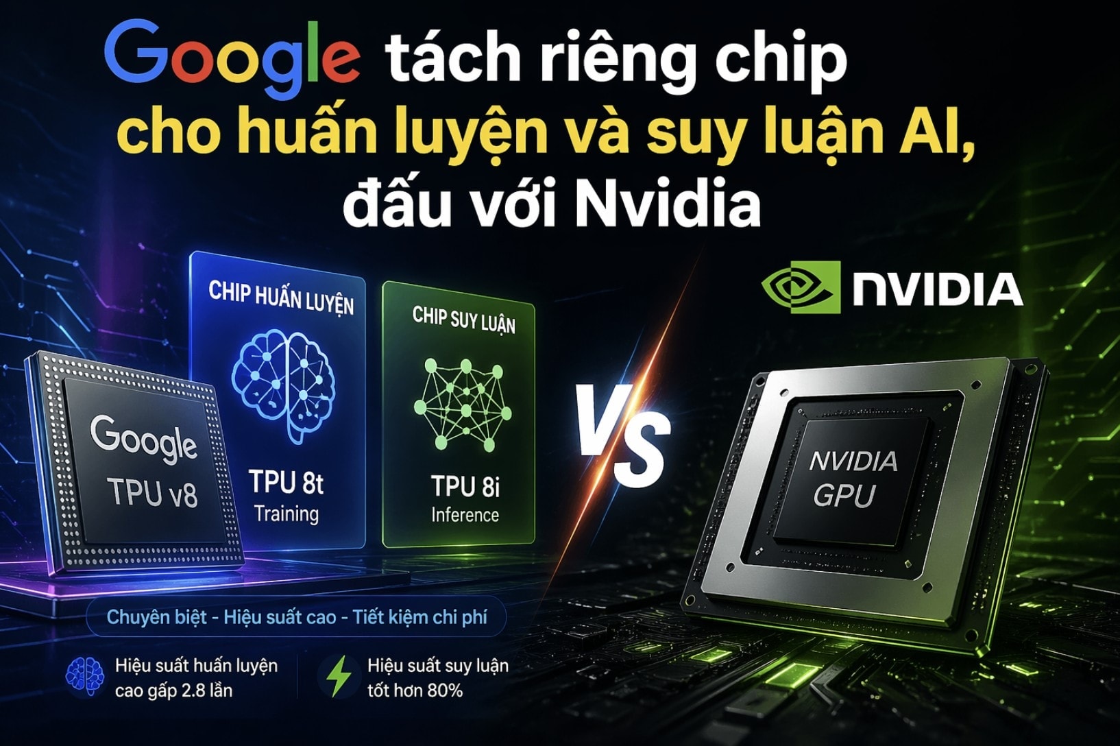 Google cho biết TPU 8t, chip huấn luyện AI mới, đạt hiệu năng cao gấp 2,8 lần so với TPU thế hệ thứ 7 là Ironwood (ra mắt tháng 11/2025) dù cùng mức giá. Trong khi đó, chip suy luận mới là TPU 8i có hiệu năng tốt hơn 80%. Cả hai loại chip AI này sẽ được cung cấp cuối năm 2026.