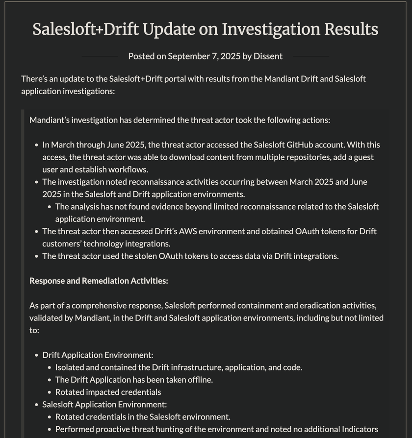 Trong một cuộc trò chuyện trực tuyến, đại diện của ShinyHunters tiết lộ rằng chúng đã tiếp cận được Gainsight nhờ một chiến dịch tấn công trước đó nhắm vào khách hàng của Salesloft - một công ty cung cấp nền tảng tiếp thị sử dụng AI và chatbot có tên Drift. Trong vụ việc đó, tin tặc đã đánh cắp các mã thông báo xác thực Drift từ những khách hàng này, qua đó giành quyền truy cập vào các phiên bản Salesforce liên kết và tải xuống dữ liệu.