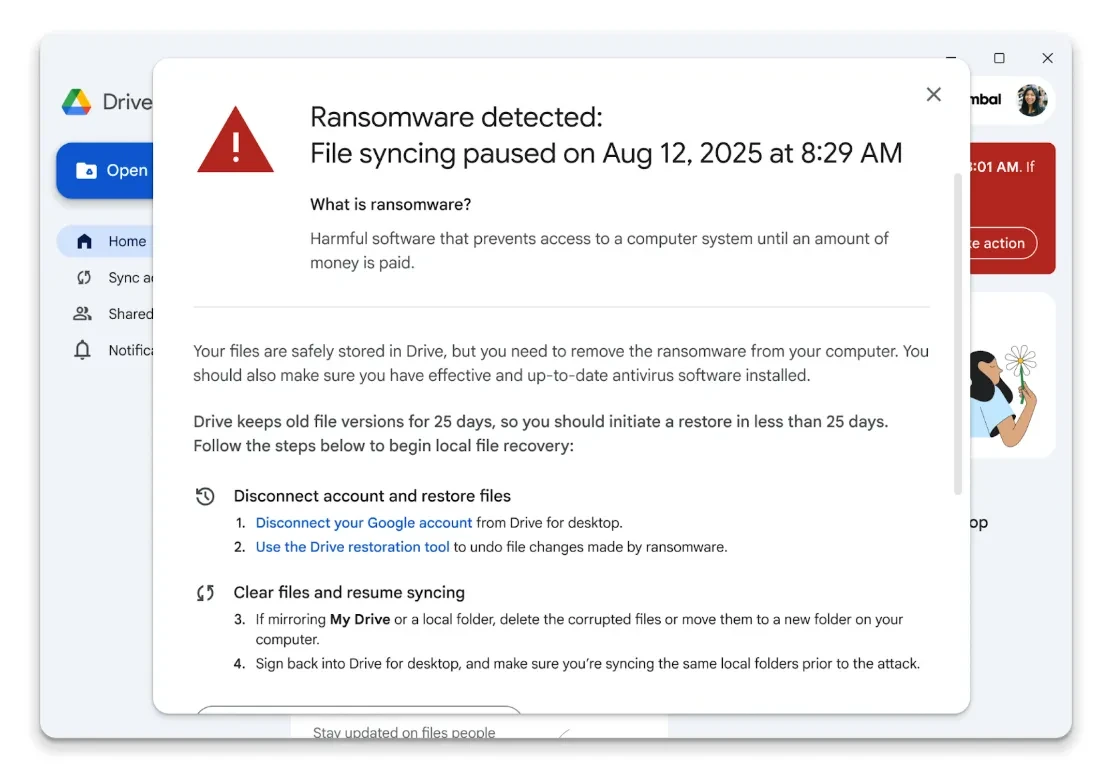 Drive for desktop phát hiện ransomware và tạm dừng đồng bộ dữ liệu đám mây - Ảnh: Google