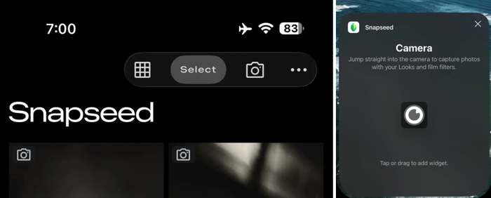 Trước đây, camera Snapseed chỉ có thể mở từ tiện ích Màn hình khóa, Trung tâm điều khiển hoặc mục Camera Control. Giờ đây, biểu tượng camera đã xuất hiện ở góc trên bên phải giao diện ứng dụng.