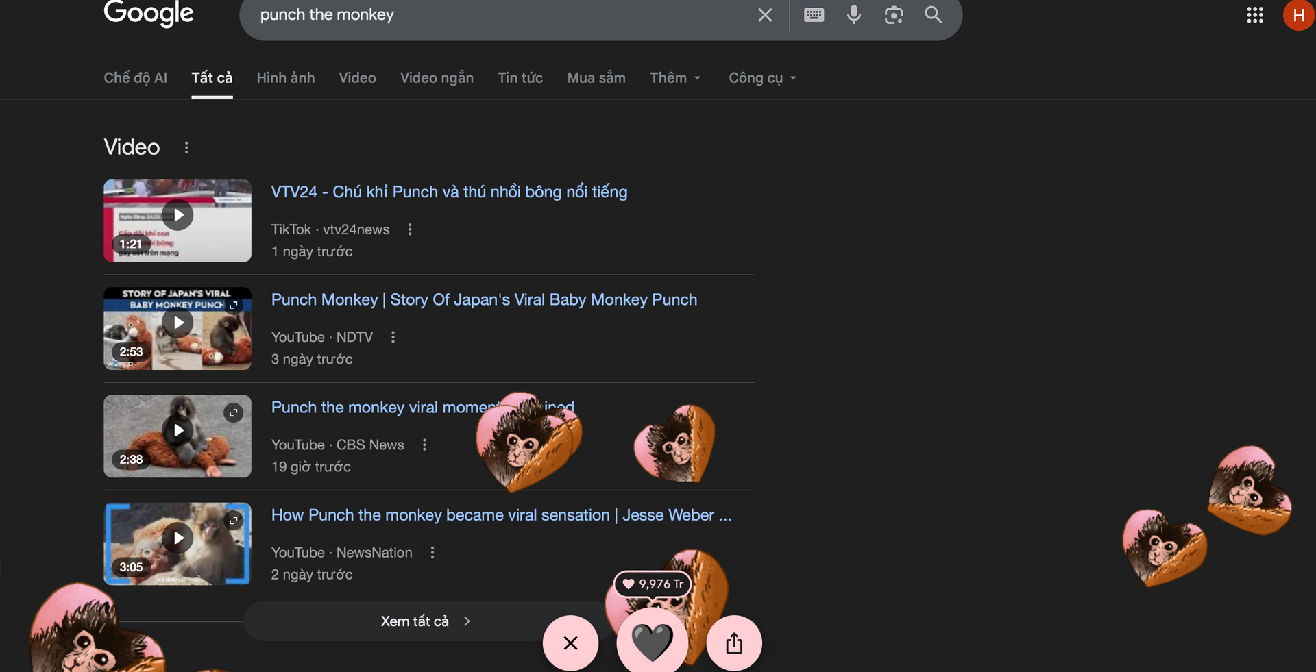 Phản hồi đầy tinh nghịch từ Google, được cho là đã gắn với hơn 9 triệu lượt “thả tim” liên quan đến xu hướng này, phản chiếu làn sóng emoji trái tim và biểu tượng quan tâm xuất hiện dày đặc kể từ khi Punch trở nên nổi tiếng.