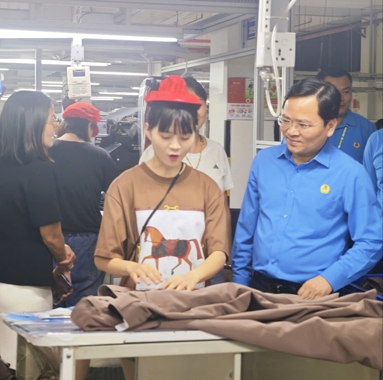 Lãnh đạo Tổng Liên đoàn Lao động Việt Nam thăm hỏi đời sống người lao động ngành dệt may tại Hà Nội. Ảnh: Nguyễn Hải.