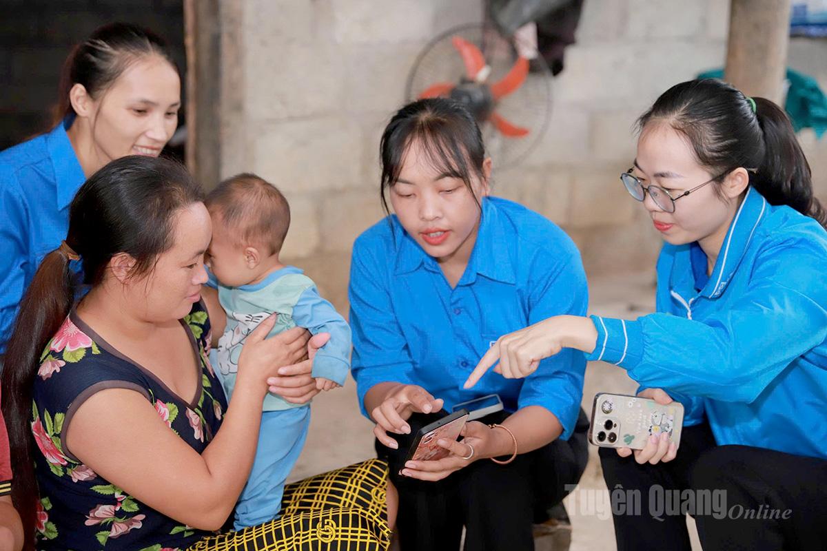 Đoàn viên xã Yên Minh tuyên truyền, hướng dẫn người dân góp ý vào Văn kiện Đại hội XIV của Đảng qua VNeID.