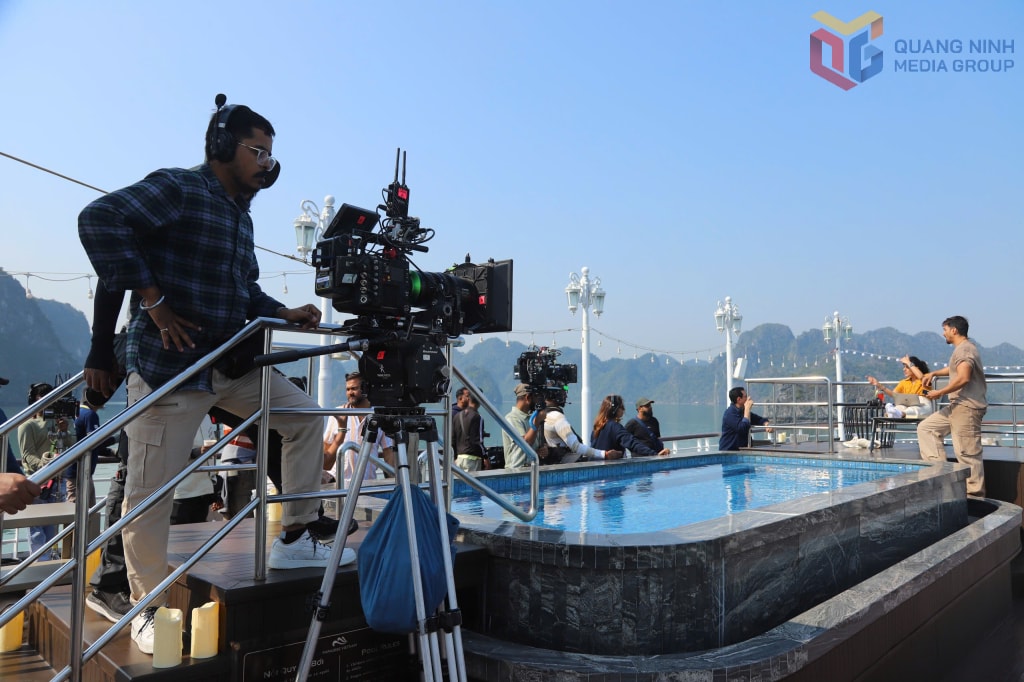 Đại biểu đề nghị chỉ áp dụng chính sách hoàn trả chi phí cho các đoàn làm phim nước ngoài đối với các chi phí phát sinh trực tiếp tại Việt Nam và cần có cơ chế thẩm định, giám sát minh bạch (Trong ảnh: Đoàn phim “Silaa” của Ấn Độ ghi hình các cảnh quay tại vịnh Hạ Long). Nguồn: Quang Ninh Media Group