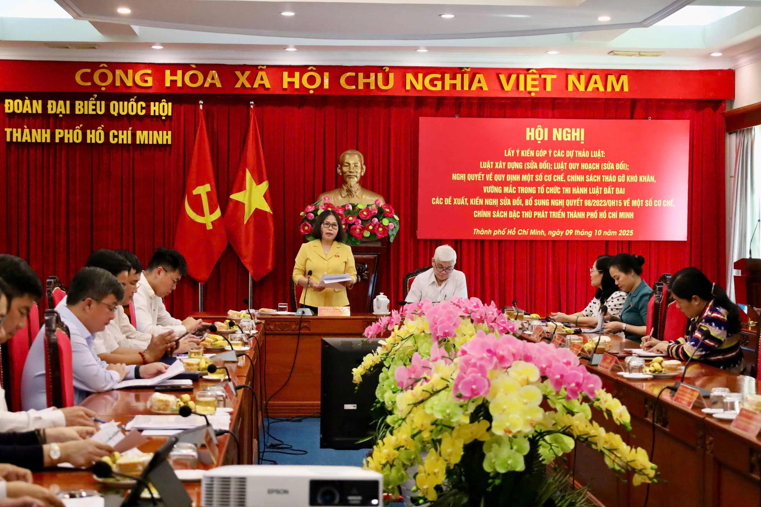 Sáng 9-10, Đoàn ĐBQH TPHCM tổ chức lấy ý kiến góp ý các dự thảo luật: Luật Xây dựng (sửa đổi); Luật Quy hoạch (sửa đổi); Nghị quyết về quy định một số cơ chế, chính sách tháo gỡ khó khăn, vướng mắc trong tổ chức thi hành Luật Đất đai; các đề xuất kiến nghị sửa đổi bổ sung Nghị quyết 98/2023/QH15 Quốc hội về thí điểm một số cơ chế, chính sách đặc thù phát triển TPHCM.