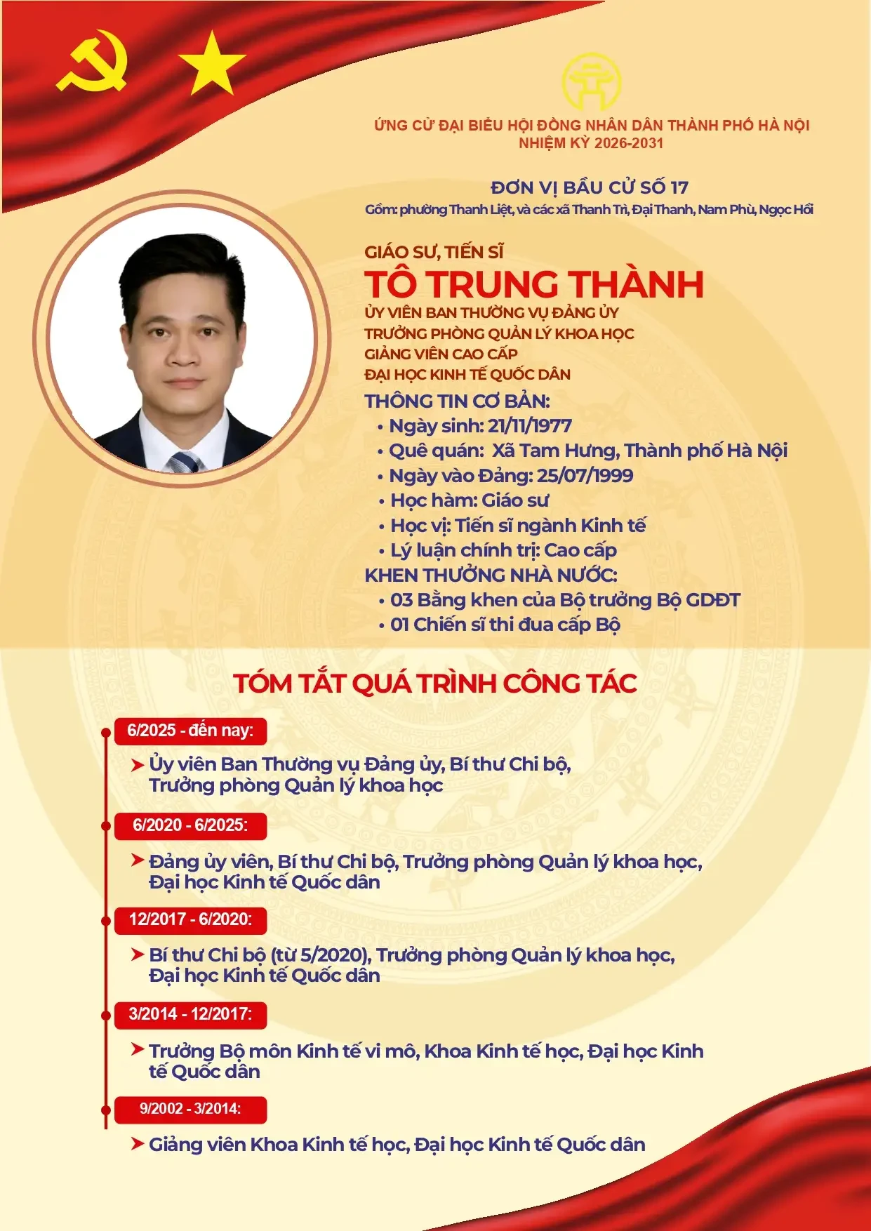 GS.TS Tô Trung Thành là đại diện của Đại học Kinh tế Quốc dân tham gia ứng cử đại biểu HĐND TP Hà Nội nhiệm kỳ 2026 – 2031, thể hiện vai trò và trách nhiệm của nhà trường trong việc đóng góp vào sự phát triển của Thủ đô.