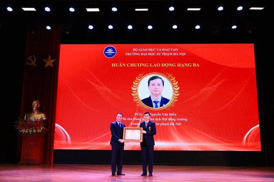 PGS.TS Nguyễn Văn Hiền – Bí thư Đảng ủy, Chủ tịch Hội đồng trường được nhận Huân chương Lao động hạng Ba. Bên cạnh đó, Nhà trường trao Bằng khen của Thủ tướng Chính phủ, Bằng khen Bộ GD&ĐT, danh hiệu Giảng viên tiêu biểu và Viên chức hành chính tiêu biểu năm học 2024 – 2025.