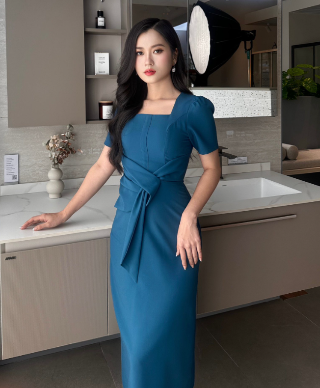 Cô thường lựa chọn các thiết kế đầm liền thân với đường cắt may tinh xảo, nhấn nhá vào vòng eo để tạo phom dáng đồng hồ cát. Một ví dụ điển hình là chiếc đầm xanh ngọc với chi tiết thắt eo duyên dáng và cổ vuông trang nhã. Ảnh: FBNV