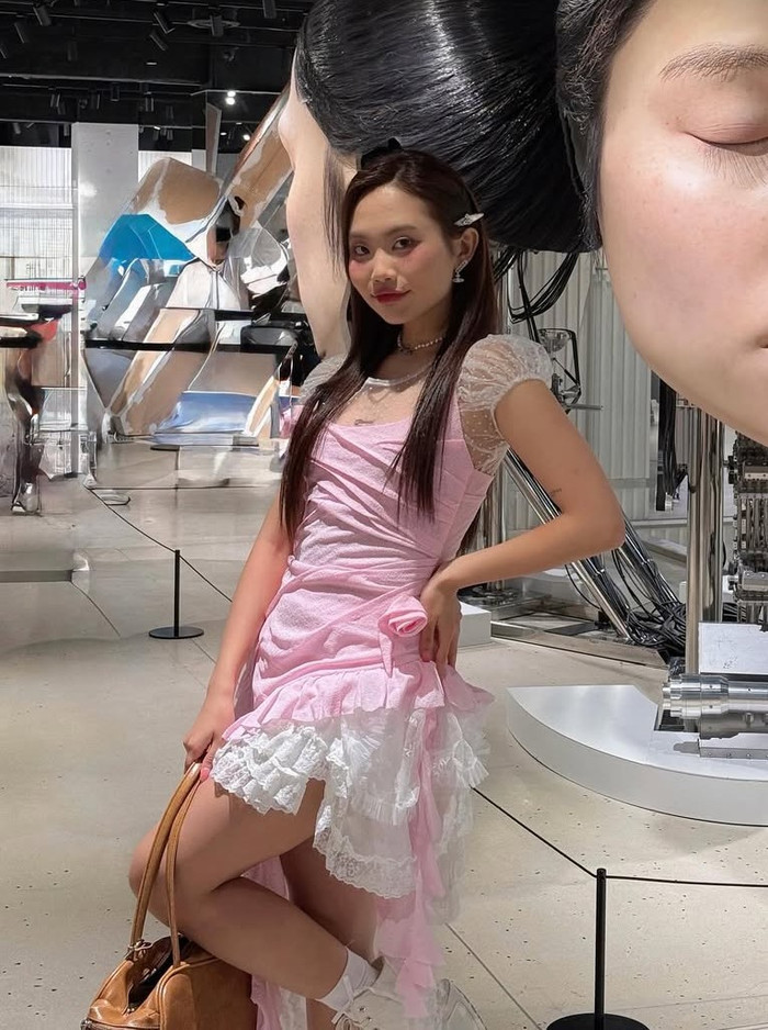 Gu thời trang đời thường của Phương Mỹ Chi nhìn chung hướng đến sự tối giản về màu sắc và phom dáng, với tông pastel như hồng nhạt, trắng, xám làm chủ đạo, kết hợp hài hòa để tạo cảm giác dễ chịu. Đôi khi cô điệu đà với áo hồng ngọt ngào cùng váy trắng ngắn, thể hiện sự linh hoạt trong phong cách. Ảnh: IGNV