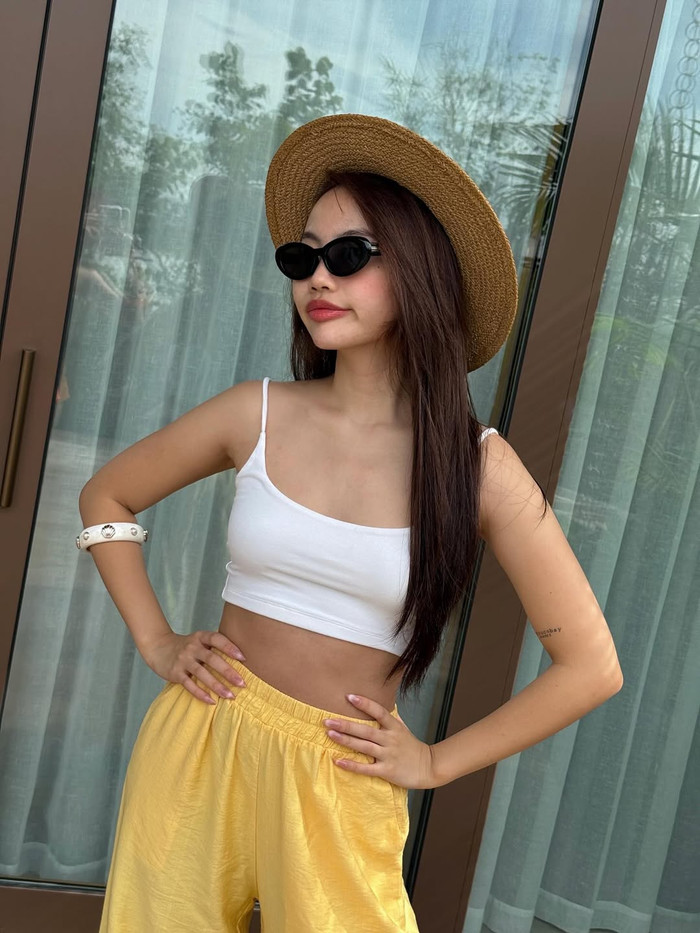 Phương Mỹ Chi thường chọn những món đồ cơ bản từ các thương hiệu nội địa hoặc item sẵn có trên thị trường, tránh phụ thuộc vào hàng hiệu đắt đỏ. Chẳng hạn, nữ ca sĩ phối chiếc áo dây trắng cùng quần vàng ống rộng, tạo nên sự cân bằng giữa phần trên ôm sát tôn dáng và phần dưới rộng rãi. Ảnh: IGNV