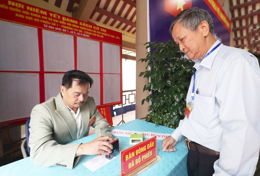 Đóng dấu đã bỏ phiếu cho cử tri tại buổi vận hành thử quy trình bỏ phiếu tại Khu vực bỏ phiếu số 7 (phường Tây Hồ). Ảnh: Ngọc Tú