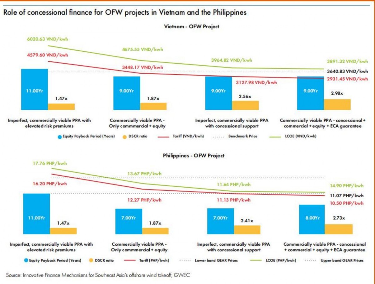 Tài chính ưu đãi giúp giảm đáng kể giá điện và cải thiện hiệu quả tài chính của các dự án điện gió ngoài khơi tại Việt Nam và Philippines. Nguồn: GWEC