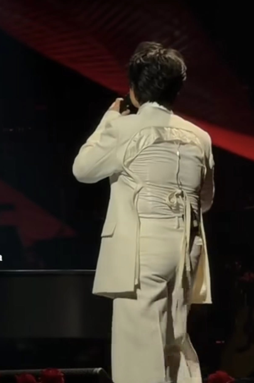 Đáng chú ý, khoảng hở lớn phía sau lưng để lộ chiếc sơ mi trắng và hình thể có phần mập mạp. Theo chia sẻ của Hà Anh Tuấn trên sân khấu, đây là thiết kế của Peter Do - nhà thiết kế gốc Việt hoạt động tại Mỹ.