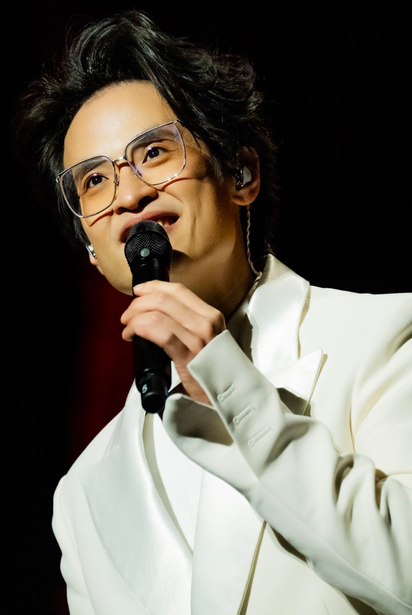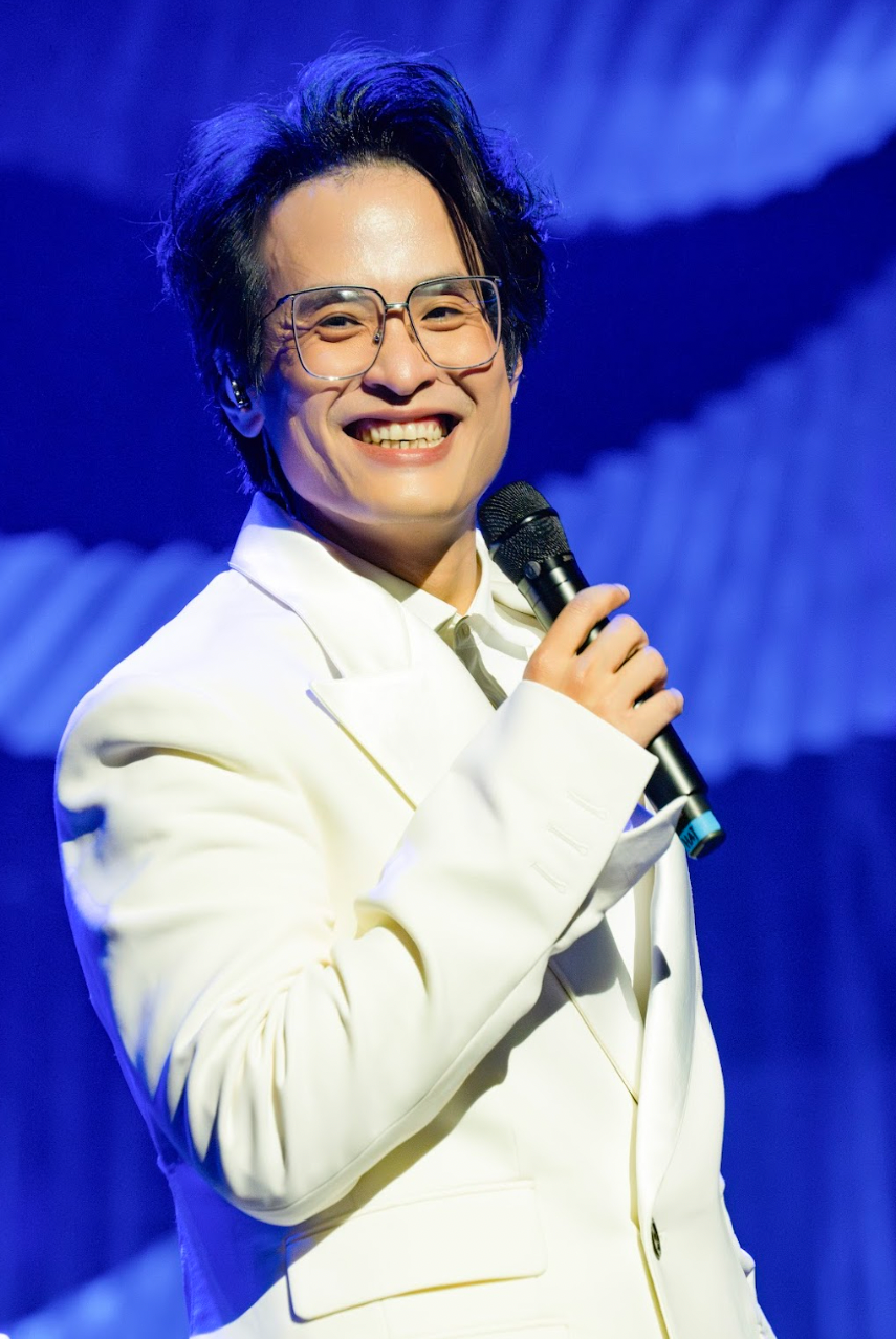 Giữa các tiết mục, anh chinh phục khán giả bằng sự duyên dáng và tinh tế trong cách dẫn chuyện. Anh cũng thay đổi đa dạng trang phục trong các set diễn. Khi diện vest trắng, ca sĩ kể thiết kế ban đầu không có sơ mi bên trong nhưng anh đã “tỉnh táo” đổi lại.