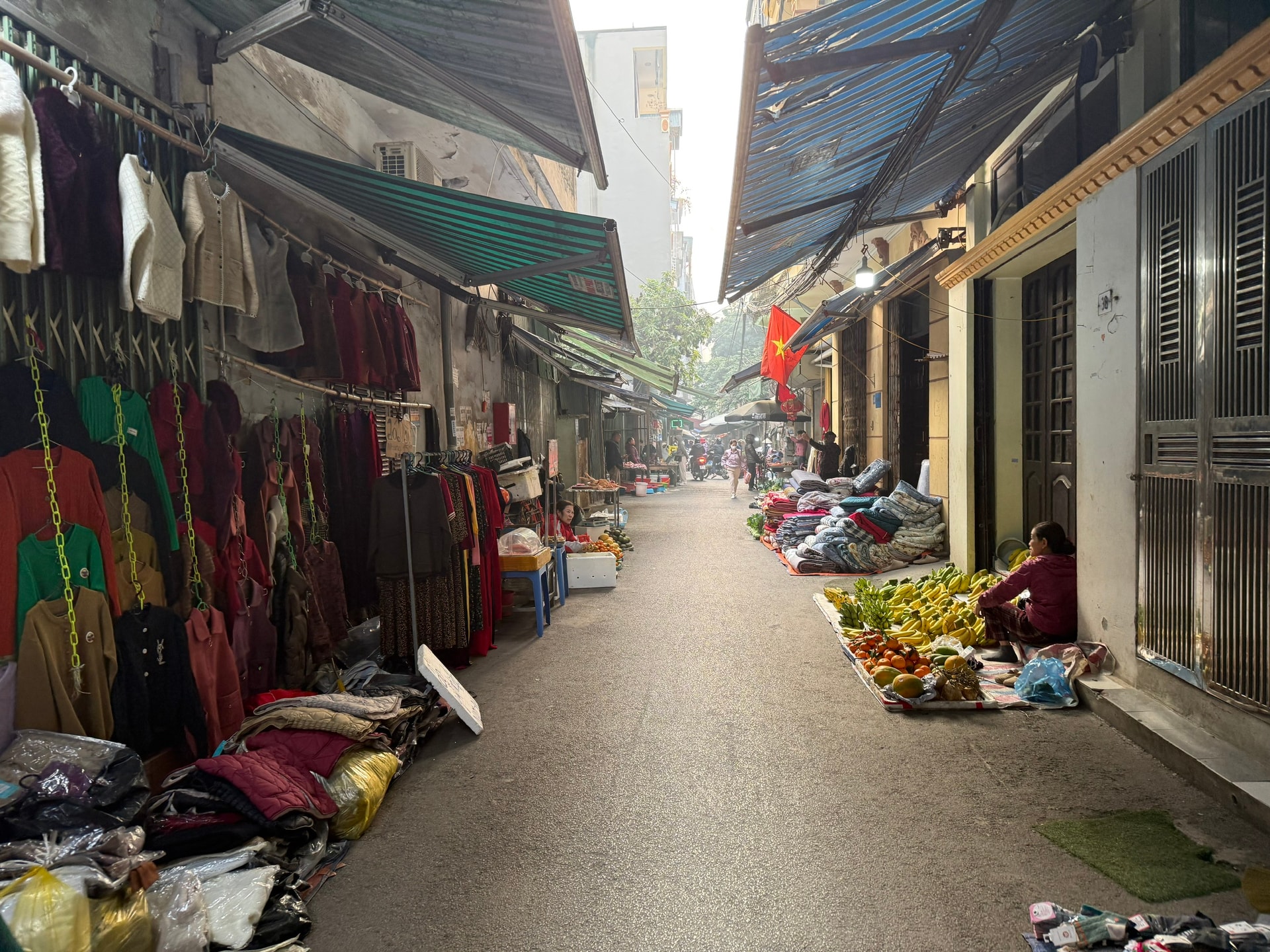 Nhiều tiểu thương ở phố Nguyễn Thái Học đã sắp xếp hàng vào bán trong nhà (ảnh chụp sáng 12-1). Ảnh: PV