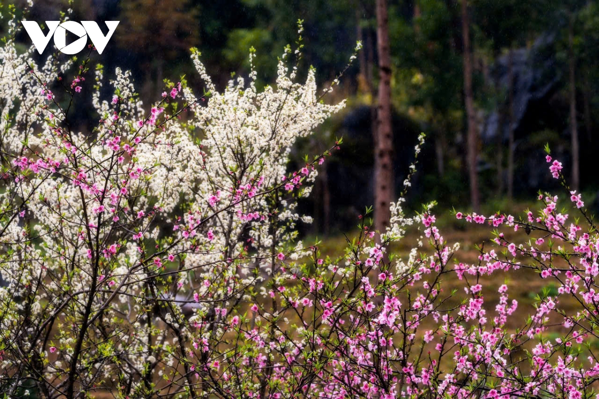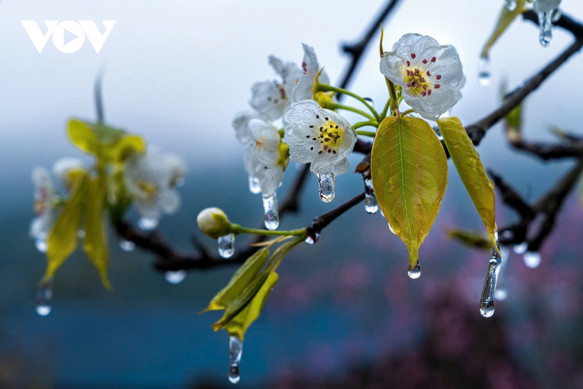 Hoa đào phai nở thắm bên hàng rào đá, hoa mận trắng muốt tinh khôi vươn mình trong sương sớm, và cả những cành lê bọc trong lớp băng giá trong suốt.