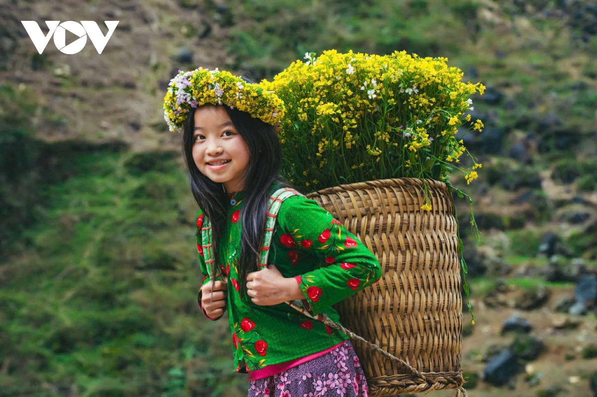 Những đứa trẻ với đôi má ửng hồng vì nẻ lạnh, khoác lên mình những bộ váy áo sặc sỡ như những cánh bướm mùa xuân. Chúng gùi sau lưng không phải là gánh nặng mưu sinh, mà là những gùi hoa cải vàng rực, hoa tam giác mạch li ti. Tiếng cười của trẻ nhỏ làm tan chảy cái lạnh cắt da cắt thịt của vùng biên viễn.