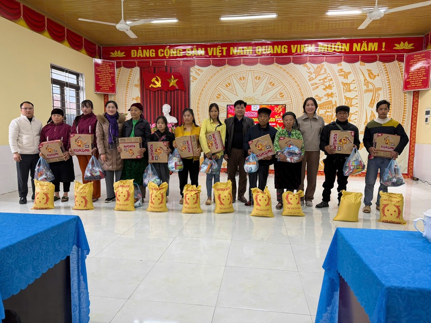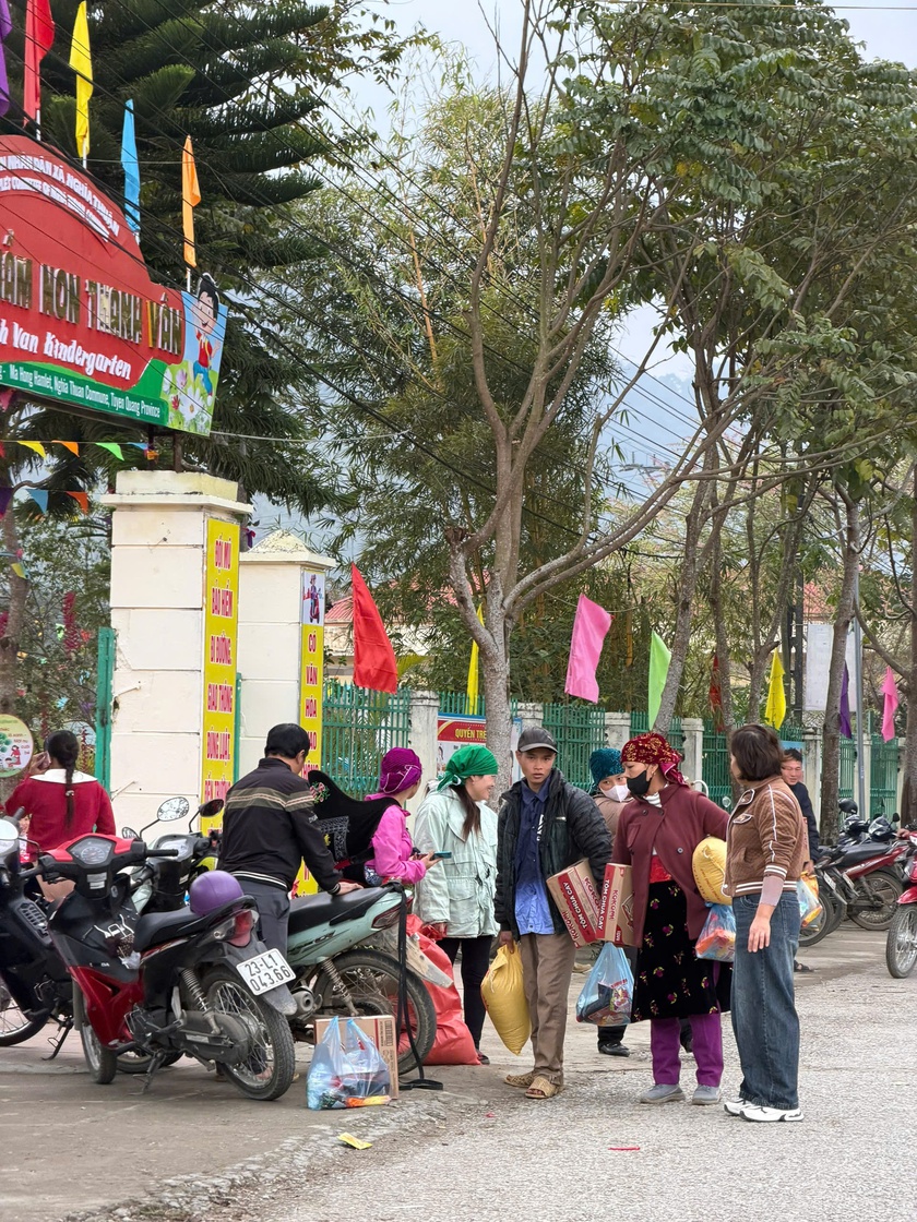Không có nghi thức rườm rà. Không có băng rôn nhiều màu. Chỉ có sự chuẩn bị lặng lẽ, nhịp nhàng. Quà đã được tập kết gọn gàng trong hội trường mượn tạm của Trường Mầm non xã. Đồng bào cũng đã đến khá đông.