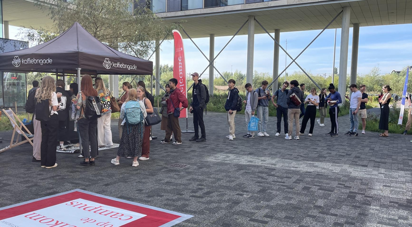 Sinh viên xếp hàng mua cà phê tại quầy Koffiebrigade được dựng lên vào ngày đầu tiên của năm học tại khuôn viên Công viên Khoa học của Đại học Amsterdam. Hình ảnh: NL Times
